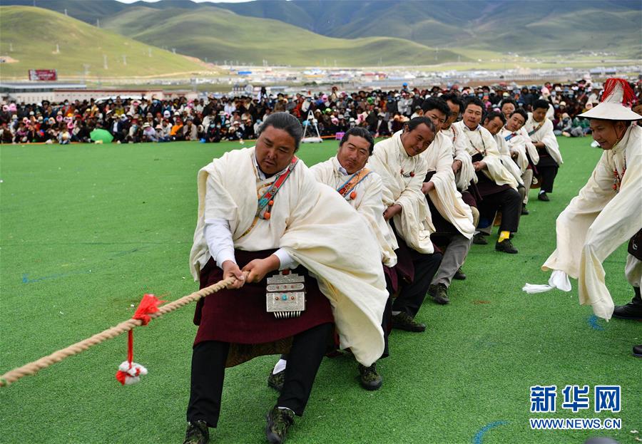 8月10日,當(dāng)雄縣牧民在拔河比賽中。新華社記者晉美多吉攝。