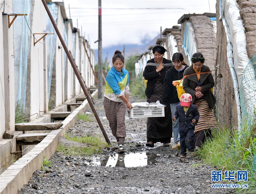 格桑旺姆(左三)和姐姐德吉卓瑪(左一)帶領(lǐng)雇傭的殘障村民巴珍(右一)搬運(yùn)大棚出產(chǎn)的新鮮蔬菜(8月3日攝)。新華社記者 李賀 攝