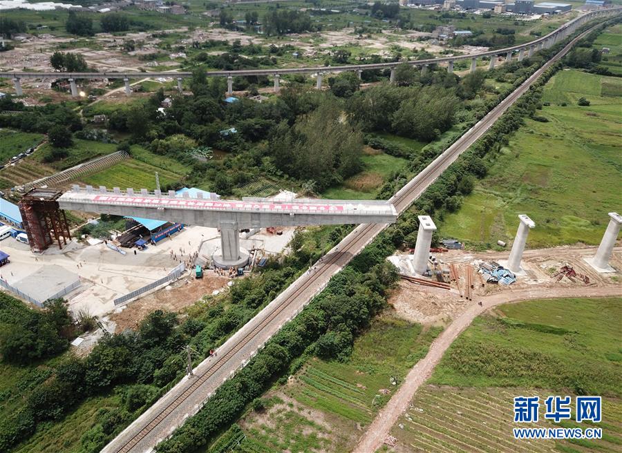 這是8月12日拍攝的水蚌鐵路蚌埠段改線工程東站疏解線特大橋跨越京滬鐵路上行線轉(zhuǎn)體梁轉(zhuǎn)體施工現(xiàn)場(無人機(jī)照片)。新華社記者 劉軍喜 攝