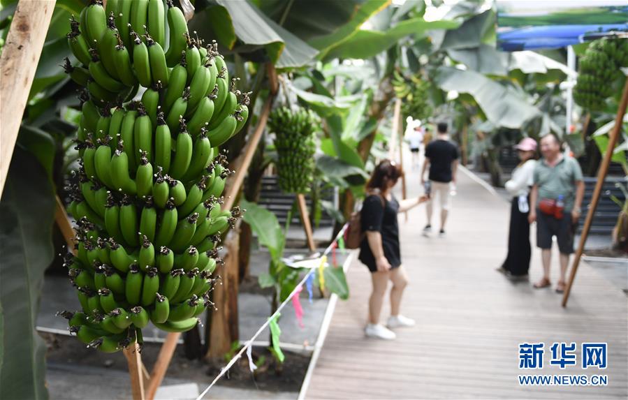 在吉林省永吉縣萬昌鎮(zhèn)宇豐紅果木瓜產(chǎn)業(yè)園,游客與大棚內(nèi)的香蕉合影留念(8月12日攝)。新華社記者 許暢 攝