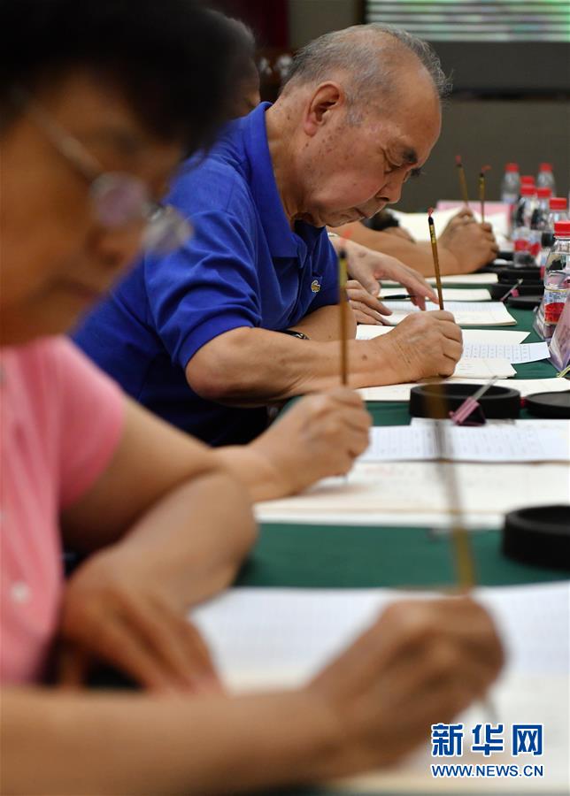 8月13日,陜西師范大學(xué)退休教師韓月娥(左二)等書寫錄取通知書。當(dāng)日,陜西師范大學(xué)2020年手寫錄取通知書正式開筆。該校自2007年起采用毛筆書寫錄取通知書的方式,為新生傳遞佳音。今年,學(xué)校十余位退休教師、在職教師、校友代表等書法愛好者將為約4500名新錄取的本科生送上帶著墨香的大學(xué)錄取通知書。新華社記者張博文攝