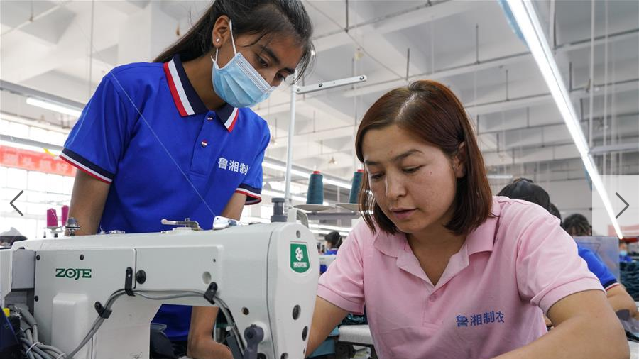 6月11日,在新疆喀什市一家服裝企業(yè)生產(chǎn)車間里,組長艾尼皮古麗·玉麥爾(右)在指導(dǎo)工人縫制布料。