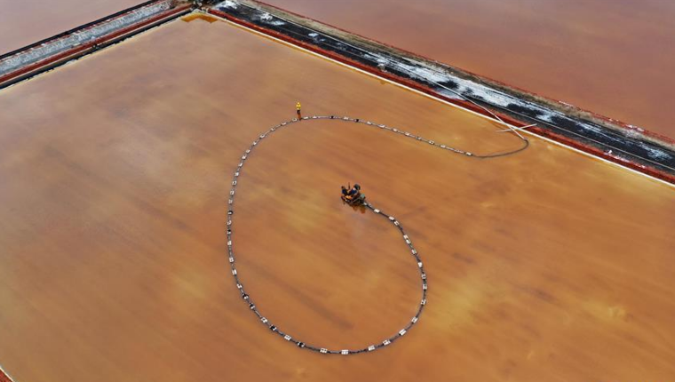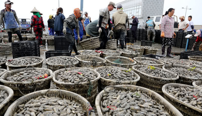2019年7月9日,漁民們在江蘇連云港沿海地區(qū)海邊的灘涂上將剛收獲的海蟶運送上岸裝箱外運。