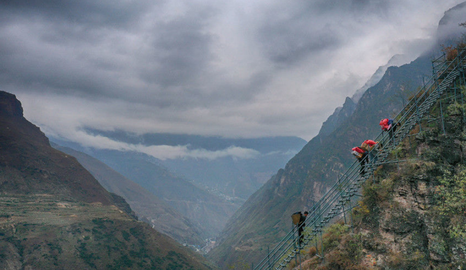 實拍懸崖村的“雙十一” 背著快遞包裹上天梯