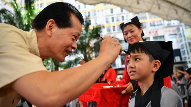 海口胡畫少兒藝術中心為500名小朋友舉行“開筆禮”,通過“點朱砂,啟智慧”“習書法,描人字”等儀式讓孩子們體驗中國傳統(tǒng)文化。