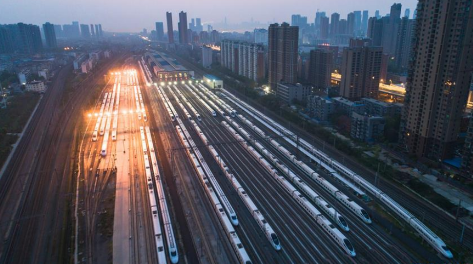 2020年4月6日,武漢動(dòng)車段高鐵動(dòng)車組整裝待發(fā)(無人機(jī)照片)。