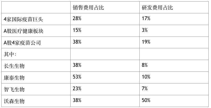 從科研投入來看,其與國際巨頭亦存在巨大差距。以A股為例,目前上市有4家以疫苗為主業(yè)的企業(yè)。Wind數(shù)據(jù)顯示,2017年4家疫苗公司總銷售費用達18億元,占營業(yè)收入38%;4家國際疫苗巨頭(輝瑞、默沙東、賽諾菲、GSK)總銷售費用占比28%。反觀研發(fā)費用,A股醫(yī)療保健板塊總研發(fā)費用319億元,占總營業(yè)收入的2.8%;4家疫苗公司除沃森生物外,研發(fā)費用占比均未超過10%;4家國際疫苗巨頭總研發(fā)費用占比17%。