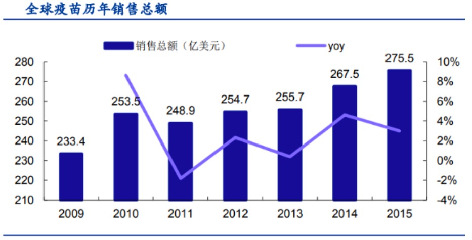 我國有45家疫苗生產(chǎn)企業(yè),可生產(chǎn)63種疫苗,預(yù)防34種傳染病,是世界上為數(shù)不多的能夠依靠自身能力解決全部計劃免疫疫苗的國家之一。從2005年到2015年的十年間,我國疫苗產(chǎn)業(yè)市場規(guī)模從65億元增至245億元,年均復(fù)合增長率達14%。