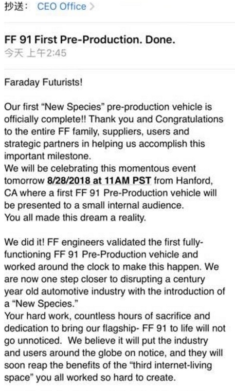 該郵件表示,第一輛“新物種”的預量產(chǎn)車已經(jīng)徹底完成。FF將于當?shù)貢r間8月28日上午11點鐘,在加利福尼亞的漢德福邀請一些小范圍的內(nèi)部觀眾,共同慶祝這一歷史性時刻。(林淼)