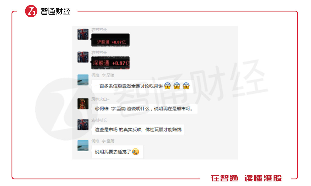 被黑天鵝痛擊一番后,市場悲觀情緒明顯占據(jù)了上風(fēng)。智通財經(jīng)APP觀察到,某500人的投資大群雖活躍度照常,但全變成了說“新財富風(fēng)月”、“品月餅”,絲毫沒有往日的“談市場、擺數(shù)據(jù)、說動向”,甚至不惜爭個臉紅耳赤的情形。