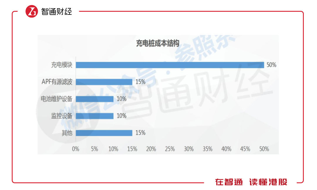 充電樁的上游是零部件的供應(yīng)商,主要為電池維護(hù)設(shè)備、充電模塊、監(jiān)控設(shè)備等,而充電樁的成本構(gòu)成中,充電模塊占比達(dá)50%,充電模塊、監(jiān)控設(shè)備及電池維護(hù)設(shè)備合計成本占比達(dá)到70%,是充電樁的核心成本。