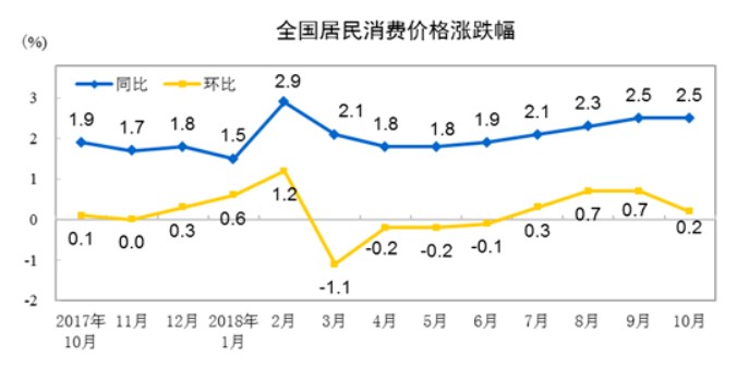 智通財(cái)經(jīng)APP獲悉,11月9日,國家統(tǒng)計(jì)局發(fā)布10月份CPI數(shù)據(jù)和PPI數(shù)據(jù)。2018年10月份,全國居民消費(fèi)價(jià)格同比上漲2.5%,預(yù)期2.5%,前值2.5%。其中,城市上漲2.5%,農(nóng)村上漲2.6%;食品價(jià)格上漲3.3%,非食品價(jià)格上漲2.4%;消費(fèi)品價(jià)格上漲2.8%,服務(wù)價(jià)格上漲2.1%。1-10月平均,全國居民消費(fèi)價(jià)格比去年同期上漲2.1%。
