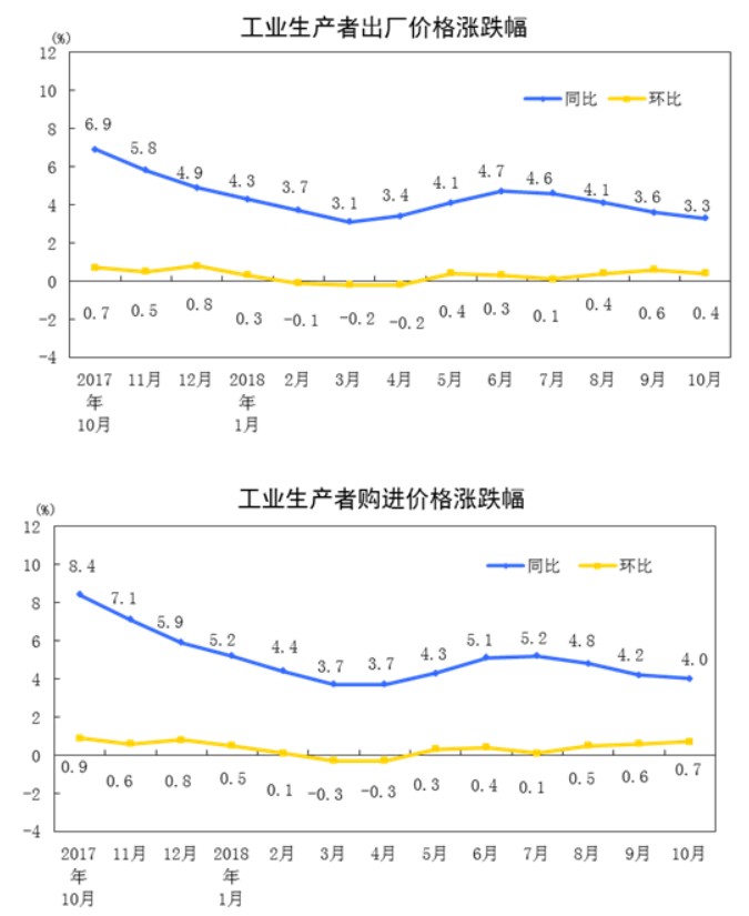 2018年10月份,全國工業(yè)生產(chǎn)者出廠價(jià)格同比上漲3.3%,預(yù)期3.3%,前值3.6%。環(huán)比上漲0.4%,前值0.6%。工業(yè)生產(chǎn)者購進(jìn)價(jià)格同比上漲4.0%,環(huán)比上漲0.7%。1-10月平均,工業(yè)生產(chǎn)者出廠價(jià)格比去年同期上漲3.9%,工業(yè)生產(chǎn)者購進(jìn)價(jià)格上漲4.5%。