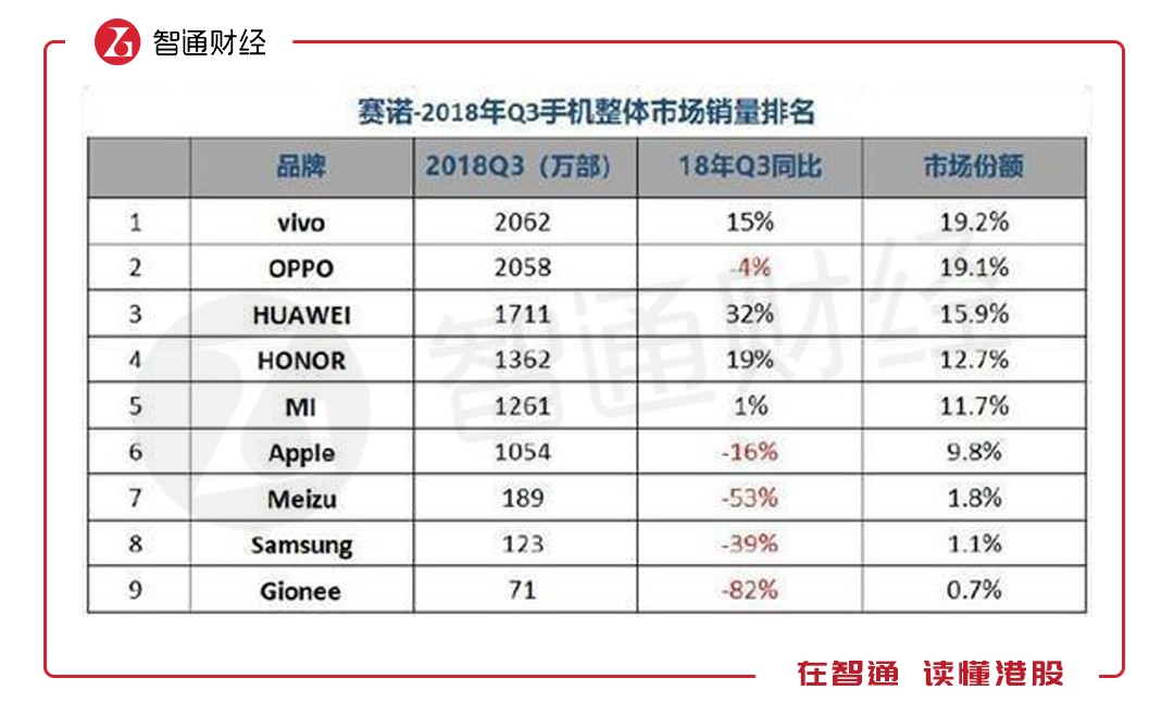 華為、小米、OPPO及Vivo四大品牌在全球逐漸吞沒其他知名品牌的市場份額,而在中國市場基本戰(zhàn)領(lǐng)了所有的市場份額,根據(jù)數(shù)據(jù)統(tǒng)計公司Counterpoint數(shù)據(jù),2018年Q3,上述四大品牌市場占有率近80%。包括蘋果、摩托羅拉及三星等國外知名品牌,以及魅族、朵唯和中興等其他眾多國內(nèi)品牌,爭奪剩下20%的市場份額,競爭以及生存環(huán)境十分殘酷。