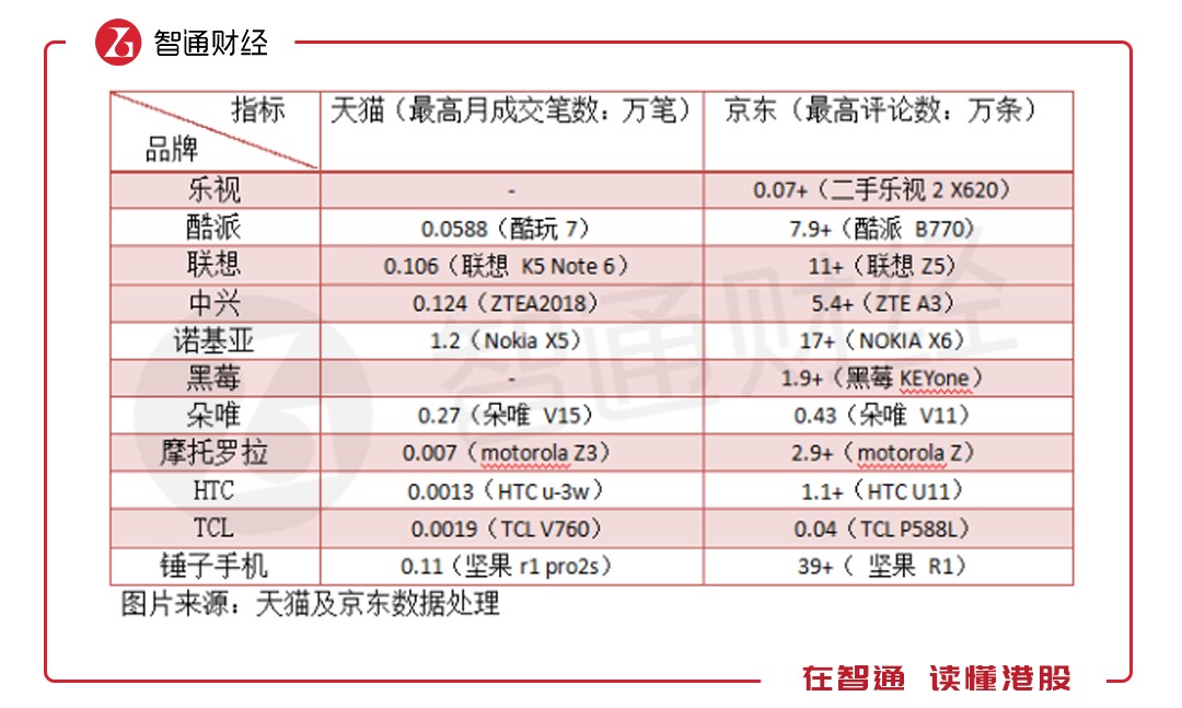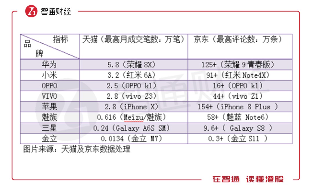 電商的崛起讓手機多了一條網(wǎng)絡(luò)強大的銷售渠道,目前天貓和京東是電商平臺中的兩大巨頭,國內(nèi)的最終商品基本在這兩大平臺售賣。智通財經(jīng)APP通過天貓及京東相對應的月成交筆數(shù)及評論數(shù)了解不同品牌的智能手機售賣情況。