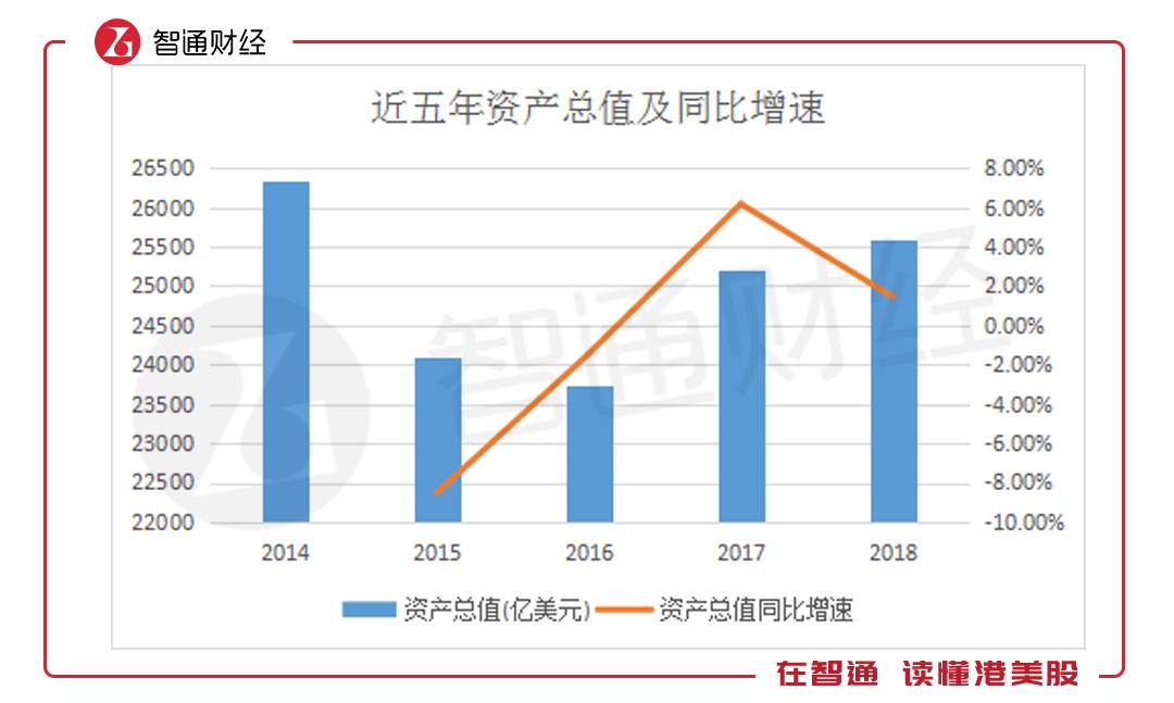 2018年,匯豐控股資產(chǎn)總值規(guī)模達(dá)26341.39億美元,較2017年同比增長1.44%,增速有所放緩。追溯歷史,匯豐控股總資產(chǎn)規(guī)模下降開始于2012年,自2015年起降幅縮小,并重新擴(kuò)表。至2017年達(dá)到大幅正增長,而于去年增速放緩。