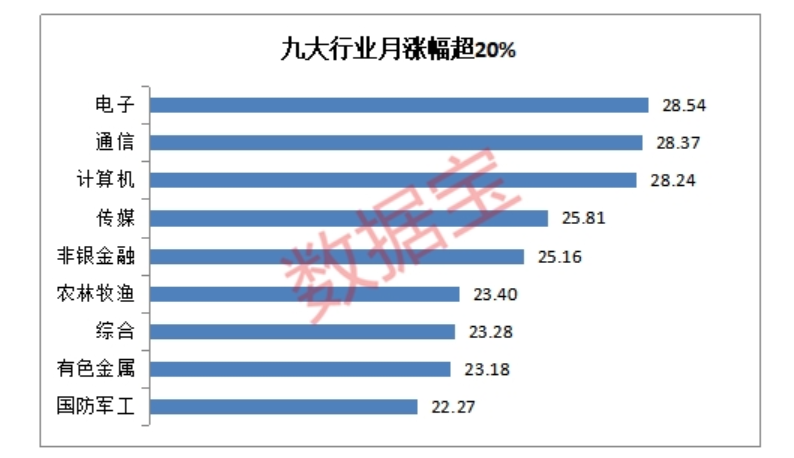 28個(gè)申萬(wàn)一級(jí)行業(yè)中,有9個(gè)行業(yè)二月份的漲幅超過(guò)20%,電子、通信、計(jì)算機(jī)、傳媒、非銀金融行業(yè)漲幅超過(guò)25%,位列前五。28個(gè)行業(yè)的月平均漲幅為18.4%,行業(yè)普漲現(xiàn)象明顯。