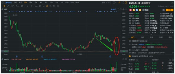 4月15日,晨鳴紙業(yè)發(fā)布業(yè)績(jī)預(yù)告稱(chēng),公司2019年一季度盈利僅在3000萬(wàn)-4500萬(wàn)元人民幣(單位下同)之間,同比下降94.25%-96.17%,公司股價(jià)大跌,恐慌性賣(mài)盤(pán)出現(xiàn)。