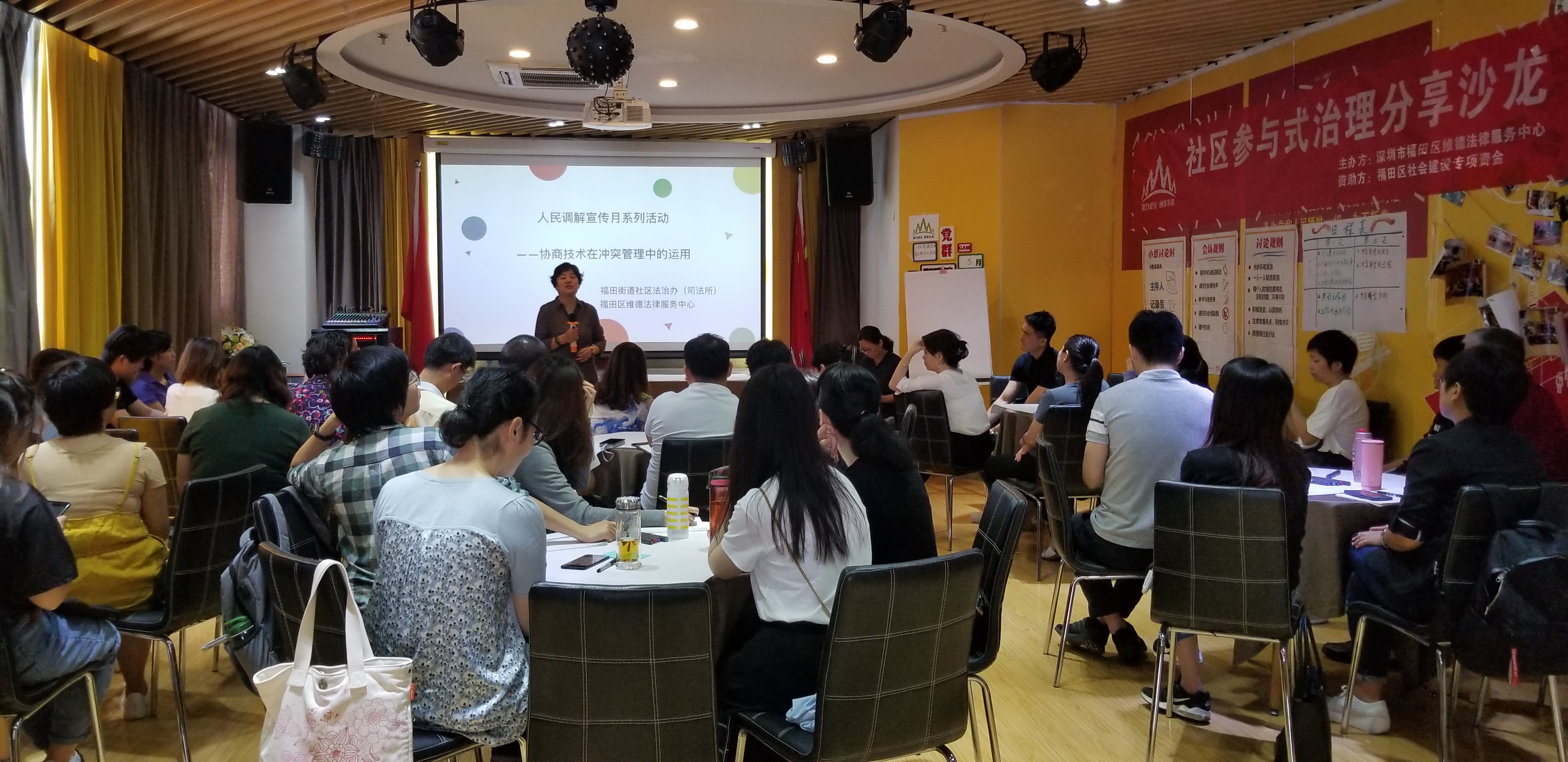 5月15-16日,由“福田區(qū)社會建設(shè)專項資金”資助的社區(qū)議事能力建設(shè)項目在福田區(qū)福田街道“白領(lǐng)e家”開展,來自福田區(qū)各個社區(qū)的人民調(diào)解員、社區(qū)法律顧問、社會工作者以及深圳市福田區(qū)維德法律服務(wù)中心邀請的志愿律師等80余人次參與了本次“社區(qū)參與式治理分享沙龍”。福田區(qū)街道黨委副書記、人大工委主任劉原鑣、深圳市福田區(qū)維德法律服務(wù)中心執(zhí)行主任李嚴(yán)出席了分享沙龍啟動儀式。