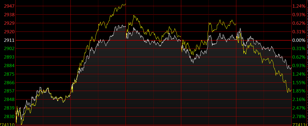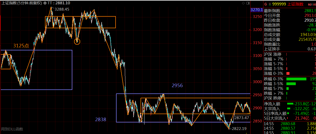 下圖為上證指數(shù)五分鐘級(jí)別走勢(shì)結(jié)構(gòu)。目前下面五分鐘中樞已出現(xiàn)中樞擴(kuò)展的情況,即擴(kuò)展為藍(lán)色框線的三十分鐘中樞。目前來(lái)看,屬于中樞震蕩的走勢(shì)結(jié)構(gòu),關(guān)注接近2838點(diǎn)的盤整背馳機(jī)會(huì),以及接近2956點(diǎn)的壓力大小。本周初,指數(shù)可能還會(huì)繼續(xù)下探2938點(diǎn),在出現(xiàn)該中樞的三賣之前,低于2838點(diǎn),都是低吸的機(jī)會(huì)。