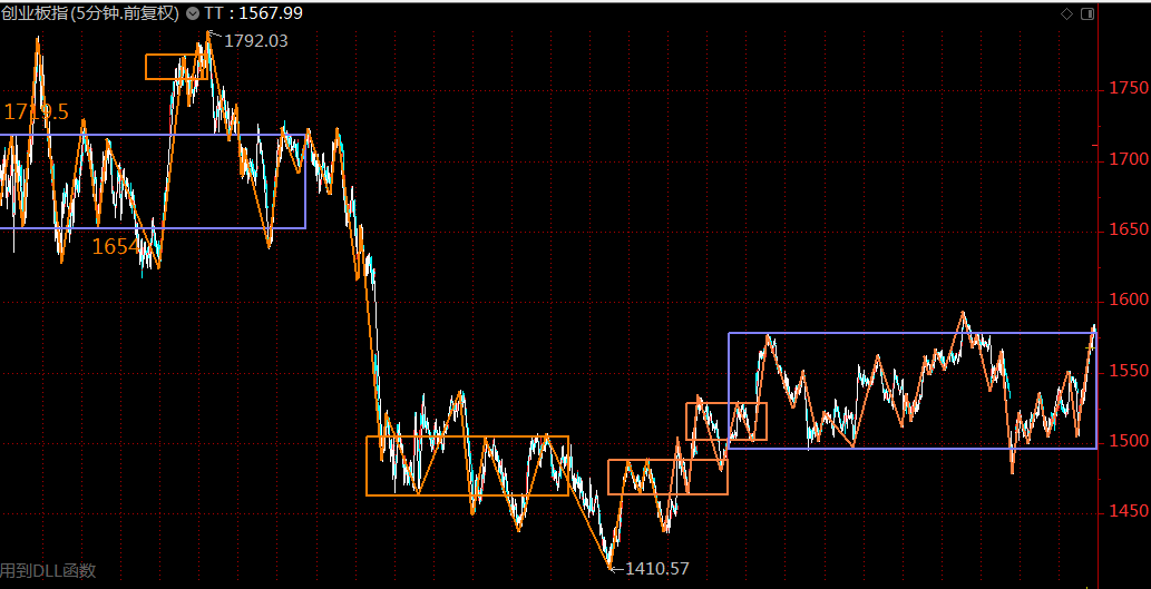創(chuàng)業(yè)板這里走的比主板強(qiáng)勢(shì)很多,周四的陽(yáng)線(xiàn)直接修復(fù)了形態(tài),目前在三十分鐘中樞內(nèi)部運(yùn)行,中樞上軌1577點(diǎn),周五已經(jīng)頂?shù)搅酥袠猩宪?,如果下周能突破此中樞,等五分鐘回落線(xiàn)段后構(gòu)建三買(mǎi),可大膽介入做多。