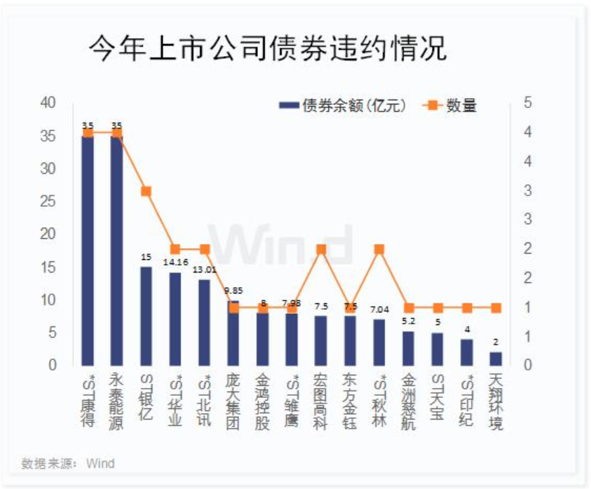 Wind數(shù)據顯示,今年以來,兩市共有15家A股上市公司累計27只債券違約,涉及債券余額總計176.24億元。