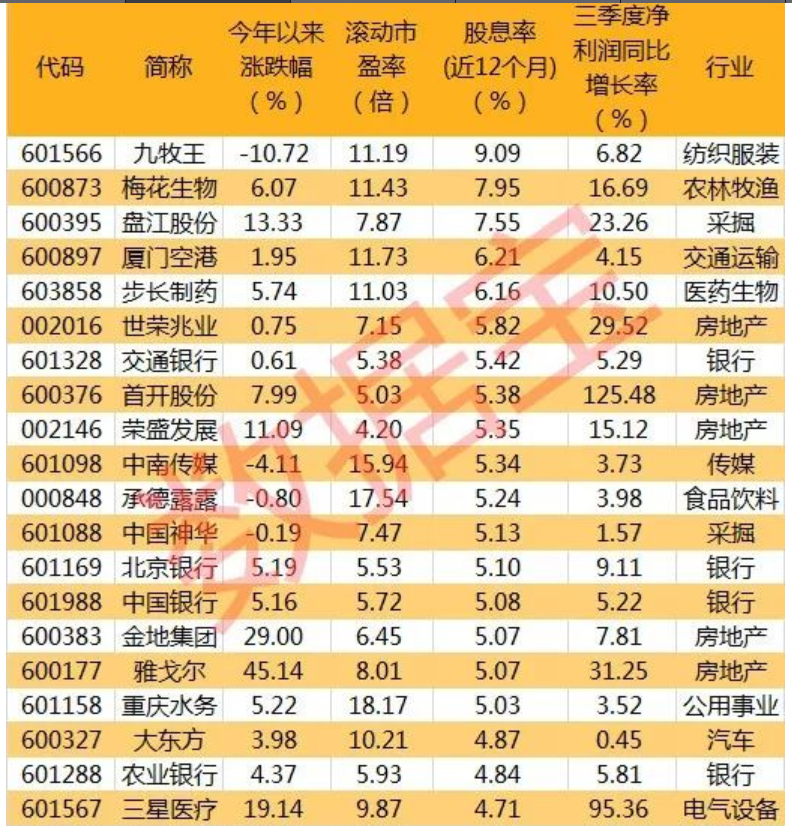 3、高股息率股票貴在穩(wěn)健、安全,長期看,即使市場出現長期調整,高股息個股也可以給投資者帶來穩(wěn)定的現金收入;目前高股息率個股的整體估值較低,根據以下條件篩選高股息率潛力股:1、滾動市盈率小于20倍;2、2016、2017、2018連續(xù)三年股息率大于4%;3、最近12個月股息率大于4%;4、前三季度凈利潤同比增長。