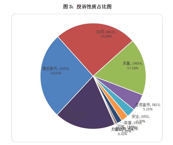 2017年,消費(fèi)者反映最突出的投訴性質(zhì)分別是售后服務(wù)29879宗,占26.42%;合同28321宗,占25.04%;質(zhì)量19654宗,占17.38%;三大性質(zhì)類別的投訴占比都超過了15%。