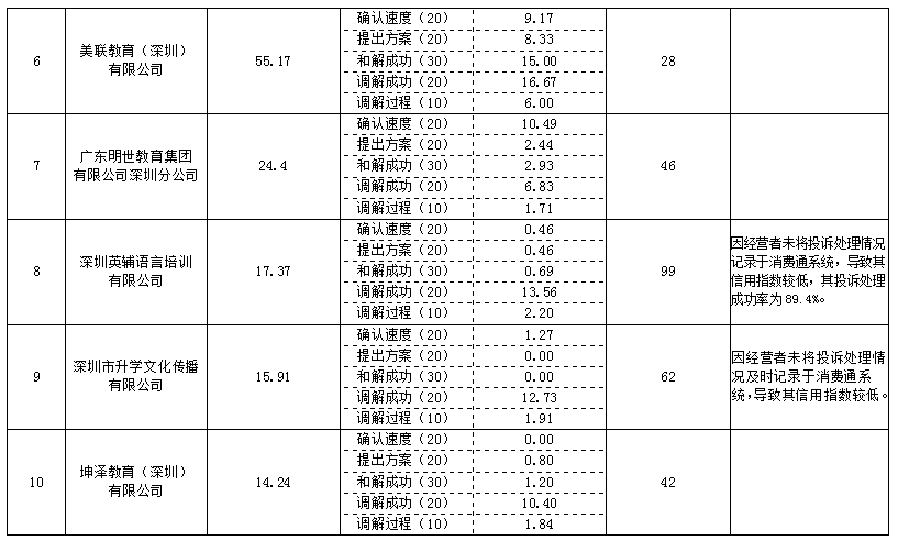 深圳英輔語言培訓(xùn)有限公司和深圳市升學(xué)文化傳播有限公司因經(jīng)營者未將投訴處理情況記錄于消費(fèi)通系統(tǒng),導(dǎo)致兩家企業(yè)信用指數(shù)較低。其中深圳英輔語言培訓(xùn)有限公司投訴處理成功率為89.4%,因未記錄于消費(fèi)通系統(tǒng),極大地影響其信用指數(shù)和排名。深圳市消委會(huì)在此提醒各行業(yè)企業(yè),重視消費(fèi)者權(quán)益保護(hù)工作,及時(shí)處理消費(fèi)者投訴、與消費(fèi)者提早和解,嚴(yán)格按照消費(fèi)通系統(tǒng)要求記錄投訴處理情況,體現(xiàn)消費(fèi)維權(quán)信用對消費(fèi)者的消費(fèi)指導(dǎo)作用。