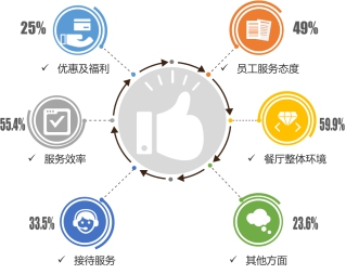 本次調(diào)查從餐廳整體環(huán)境、服務(wù)效率、員工服務(wù)態(tài)度、接待服務(wù)、優(yōu)惠及福利及其他方面等六個(gè)維度展開,其中餐廳整體環(huán)境與服務(wù)效率是消費(fèi)者最主要推薦的原因,餐廳整體環(huán)境推薦比例最高,為55.9%。