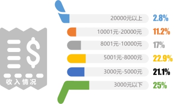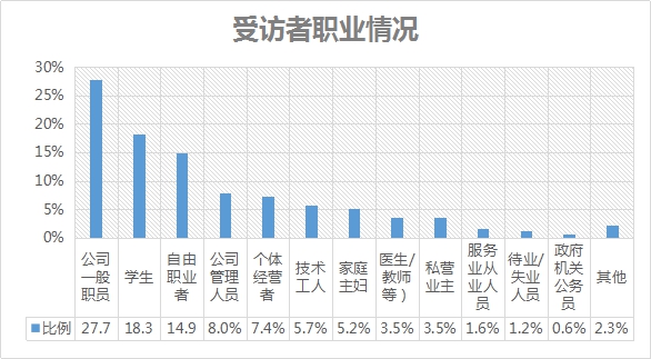 本次調(diào)研中,公司一般職員的比例最高,為27.7%,其次是學(xué)生,占比為18.3%。53.9%的受訪者其個(gè)人月收入超過(guò)5000元。