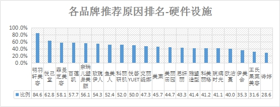 排名第一的是明羽軒美容,硬件設施推薦率為84.6%;其次是悅己堂,推薦率為62.8%;第三名是菲曼芝美容,推薦率均為58.1% 。