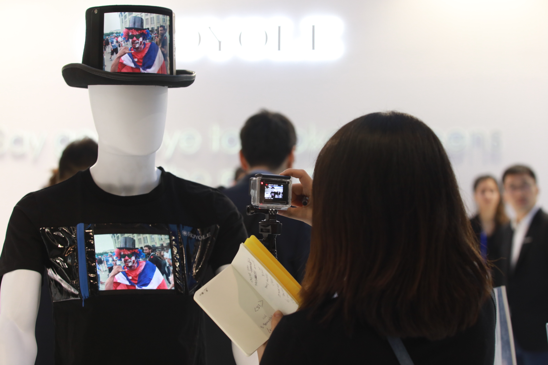 法國一女士體驗高清柔性屏?xí)r尚衣帽后對柔宇工作人員說:"柔性屏?xí)r尚衣帽套裝超酷,這個如果能穿去派對的話就太完美了。"