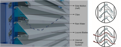 除了屋面幕墻的“防水神經(jīng)系統(tǒng)”,令人驚嘆的還有安裝在展館立面幕墻上的“人字形”百葉,這種雙片百葉同時(shí)具備50%“空氣通風(fēng)性能和95%防雨水性能。巧妙的“人字形”設(shè)計(jì),使得風(fēng)和雨水從百葉片間進(jìn)入時(shí),能夠保證空氣從向上傾斜的第一片百葉有效進(jìn)入,而雨水被第二片向下傾斜的百葉擋住,并由葉片分流至兩邊的豎框里,排出下邊框?!叭俗中巍卑偃~不僅能完全阻風(fēng)防雨,還具備超高強(qiáng)度,足以抵抗臺(tái)風(fēng)暴雨的侵襲。