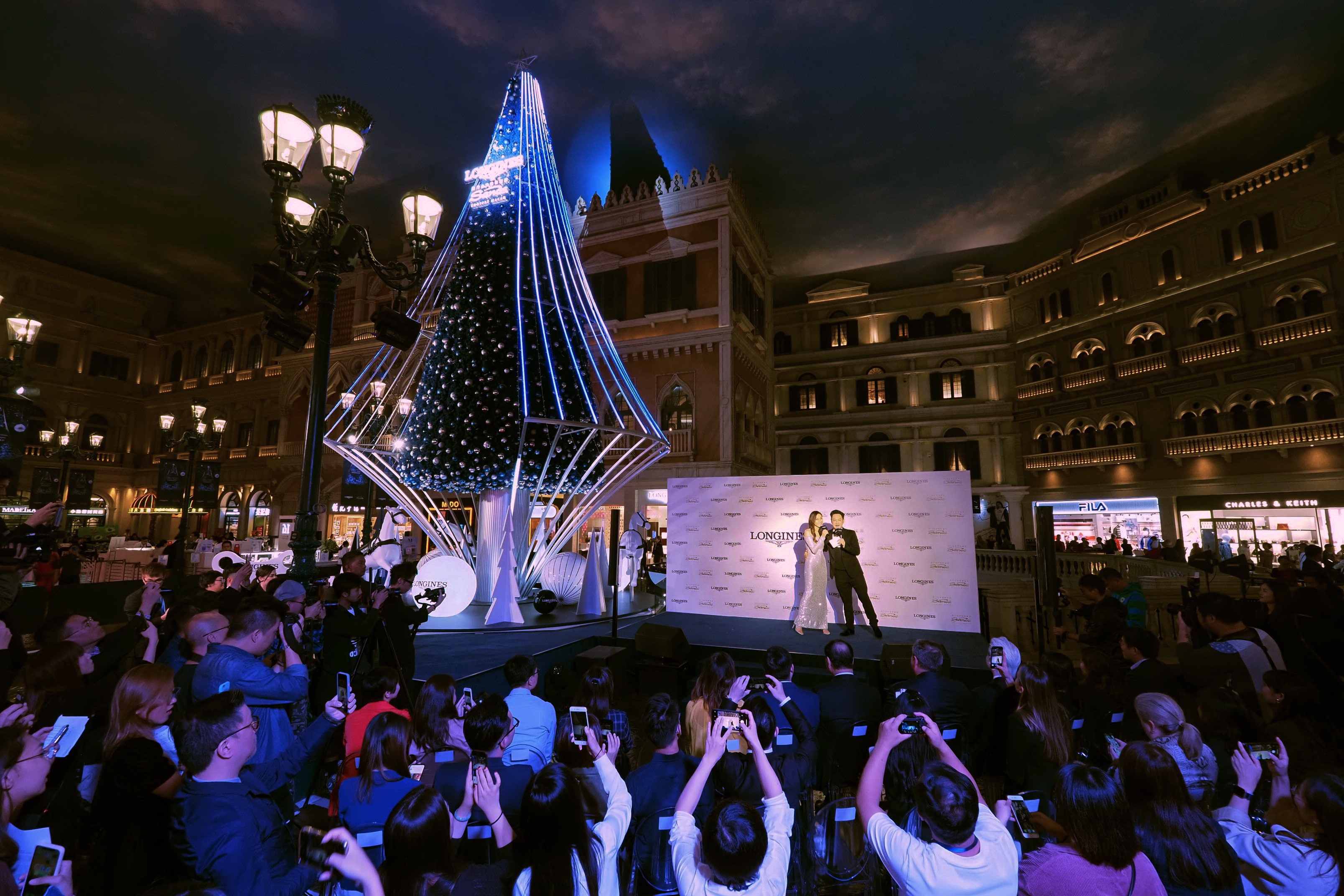 亮燈儀式于威尼斯人購(gòu)物中心圣馬可廣場(chǎng)舉行,影視明星鐘嘉欣受邀出席,并與浪琴澳門副總裁鄭美齡、金沙中國(guó)有限公司零售市場(chǎng)推廣副總裁Rita Simonetta及金沙中國(guó)有限公司商場(chǎng)管理部總監(jiān)梁俊強(qiáng)一同啟動(dòng)高達(dá)13米的藍(lán)色菱形圣誕樹(shù)底部的音樂(lè)盒裝置。