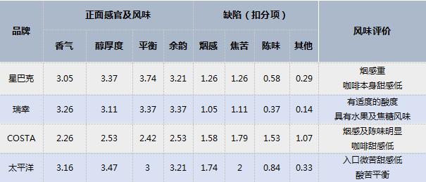 而20位咖啡達(dá)人對4款美式咖啡的整體風(fēng)味評價(jià)也不盡相同:瑞幸有適度的酸度,具有水果及焦糖風(fēng)味,接受程度最高;星巴克煙感重,咖啡本身甜感低;COSTA煙感及陳味明顯,酸酐較強(qiáng),咖啡甜感低;太平洋入口微苦甜感低,酸苦較平衡。