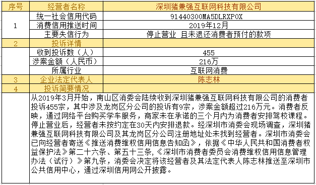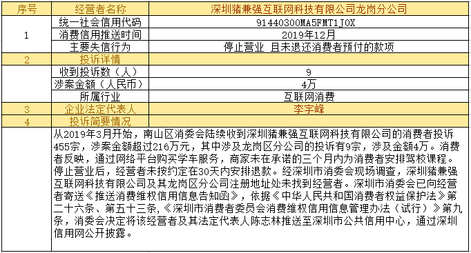 深圳新聞網(wǎng)2019年12月24日訊12月24日,為加強(qiáng)對(duì)商品和服務(wù)的社會(huì)監(jiān)督,推進(jìn)消費(fèi)領(lǐng)域信用體系建設(shè),深圳市消費(fèi)者委員會(huì)(以下簡(jiǎn)稱“深圳市消委會(huì)”)聯(lián)合福田區(qū)消費(fèi)者委員會(huì)(以下簡(jiǎn)稱“福田區(qū)消委會(huì)”)和龍崗區(qū)消費(fèi)者委員會(huì)(以下簡(jiǎn)稱“龍崗區(qū)消委會(huì)”)將深圳豬兼強(qiáng)互聯(lián)網(wǎng)科技有限公司、深圳市皇域貿(mào)易有限公司、深圳市百家順資產(chǎn)管理有限公司、深圳市予恩美容美發(fā)有限公司、深圳晶馨瑜伽有限公司等五家預(yù)付式和互聯(lián)網(wǎng)消費(fèi)領(lǐng)域停止?fàn)I業(yè)且未退還消費(fèi)者預(yù)付款項(xiàng)的經(jīng)營者及其主要負(fù)責(zé)人推送至深圳市公共信用中心,通過深圳信用網(wǎng)公開披露。