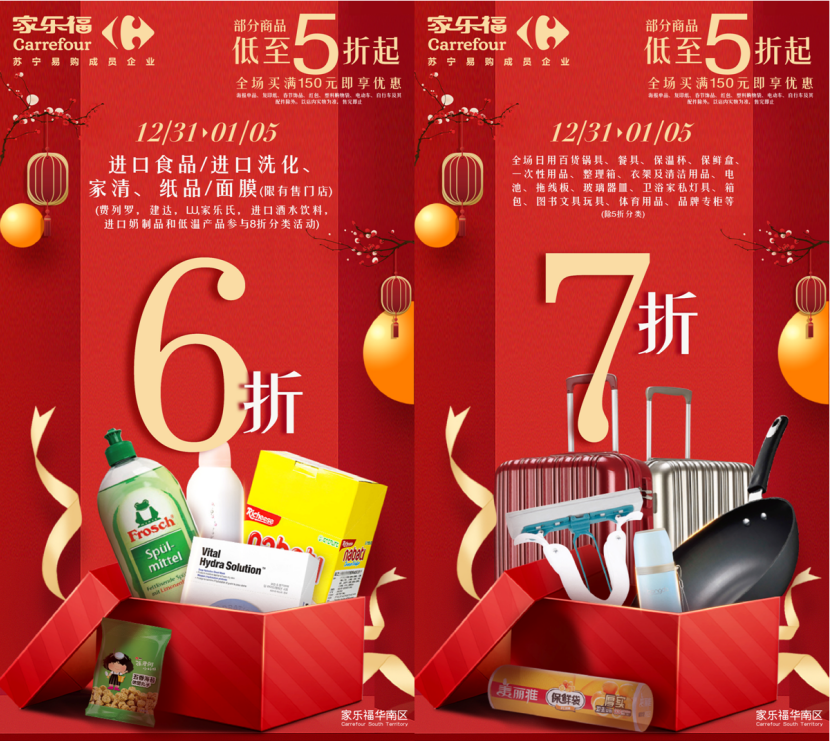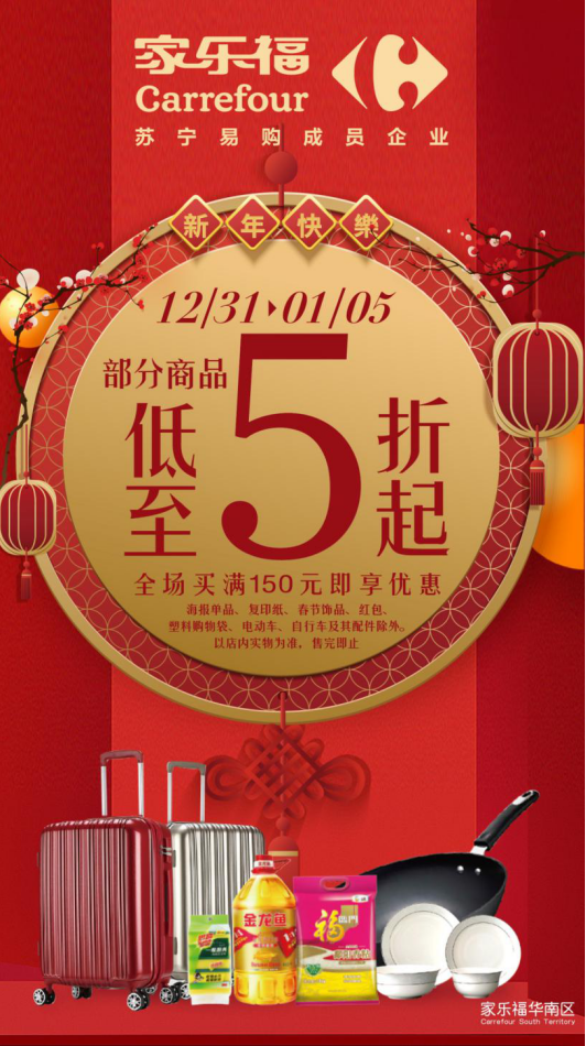 12月31日至1月5日,顧客于家樂福華南區(qū)門店全場買滿150元,即享指定產(chǎn)品5折起優(yōu)惠,省錢攻略一次解鎖。