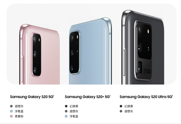 在配色的選擇上,其中Galaxy S20提供遐想灰、浮氧藍(lán)、柔霧粉三種配色,Galaxy S20+提供幻游黑、遐想灰、浮氧藍(lán)三種配色,Galaxy S20 Ultra提供幻游黑、遐想灰兩種配色。也能夠滿足不同消費(fèi)者的實(shí)際需求。