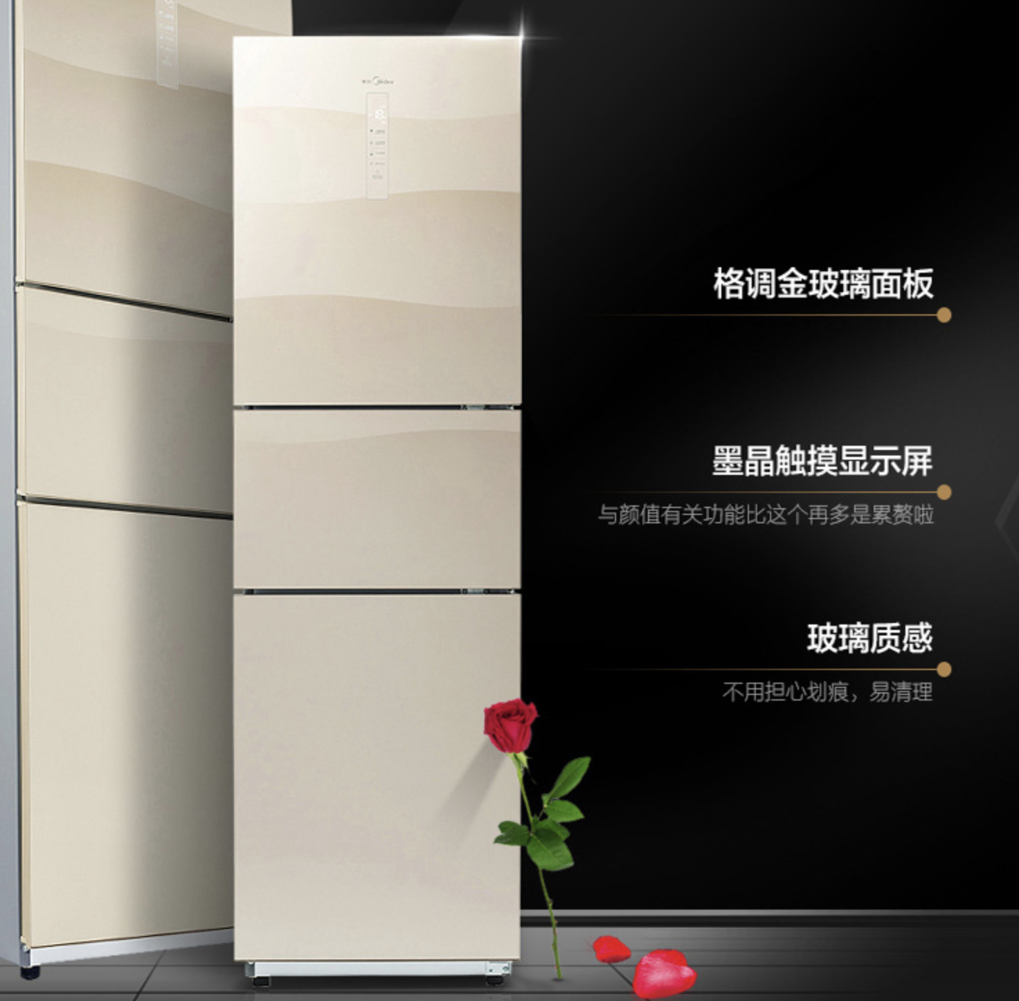 美的這款BCD-239WTGM三開門冰箱,產(chǎn)品采用金色玻璃面板與墨晶顯示屏,杜絕劃痕更有質(zhì)感,寬門設計、 隱藏暗把手、三溫區(qū)黃金比例。這款產(chǎn)品三溫區(qū)可單獨控溫,分為121升冷藏室、38升變溫室和80升冷凍室,讓儲鮮多樣化。此外,風冷無霜減輕手動除霜的負擔,保持食物原始口感。