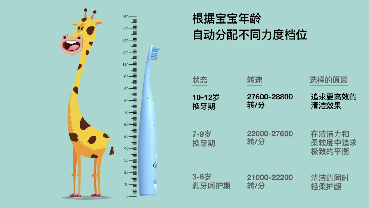 根據(jù)孩子的乳牙期、換牙期以及相應(yīng)年齡段特點(diǎn),S7000K可以自動(dòng)分配不同的轉(zhuǎn)速力度檔位功能,分階呵護(hù),讓孩子刷牙放心無憂。