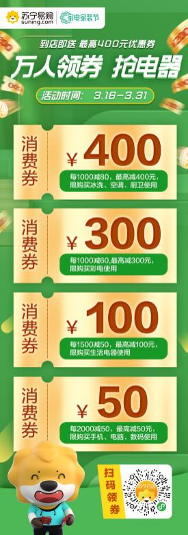 據(jù)了解,深圳蘇寧3月16日至3月31日期間放出大招,強(qiáng)勢(shì)推出“萬人領(lǐng)券搶電器”活動(dòng),攜手空調(diào)、廚衛(wèi)、冰洗、彩電、3C數(shù)碼和生活電器全品類百大品牌全面發(fā)力,以千萬補(bǔ)貼讓利回饋消費(fèi)者。針對(duì)整個(gè)粵東區(qū)域限量投放近20萬張400元、300元、100元、50元不等的家電消費(fèi)券,在活動(dòng)前期通過社群、門店、金牌V購等線上線下即可領(lǐng)取,在粵東區(qū)域所有蘇寧門店及V購均可使用。