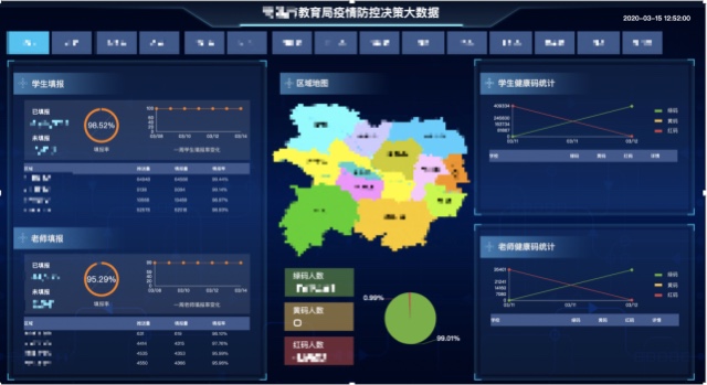 同時,企業(yè)微信的管理后臺具有多維數(shù)據(jù)展示、導出和防控數(shù)據(jù)動態(tài)可視化展示的功能,可實時監(jiān)測防控數(shù)據(jù),將數(shù)據(jù)進行分類匯總,管理者只需一鍵導出統(tǒng)計報表,就能全面掌握區(qū)域師生健康狀況,確認返校師生員工名單,全面統(tǒng)籌安排后續(xù)教學工作。