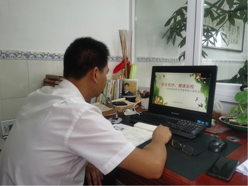 赤沙小學(xué)校長(zhǎng)李錦賢通過(guò)企業(yè)微信召開(kāi)復(fù)學(xué)前的線上家長(zhǎng)會(huì)。