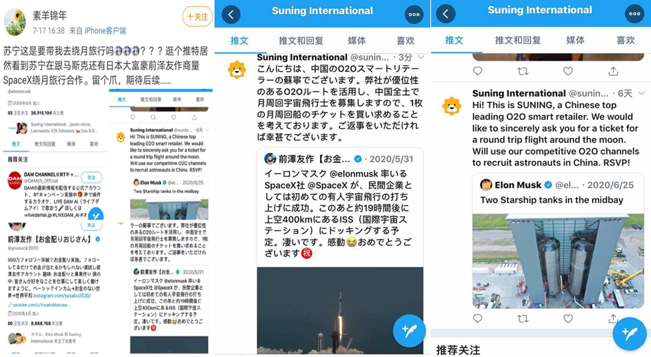 一個馬斯克,一個前澤友作,這趟萬眾矚目的繞月之旅原本跟我們國內是沒什么關系的,但因為蘇寧的出現突然有了轉機。有微博用戶爆料,蘇寧7月中時候就在推特向馬斯克及前澤友作分別拋出合作求繞月旅行船票的橄欖枝。