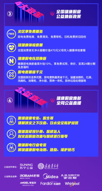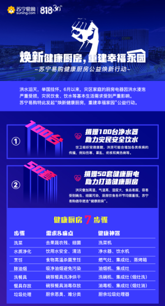 與此同時,洪水致使大批廚房電器受損,疊加高溫天氣,災(zāi)民飲食安全面臨考驗。蘇寧易購特別捐贈50套健康廚電,涵蓋油煙機(jī)、灶具、消毒柜等必備廚房電器,讓災(zāi)民更快恢復(fù)健康生活。同時,廚房作為“病從口入”最關(guān)鍵的環(huán)節(jié),洗菜、水質(zhì)凈化、烹飪除油煙、餐具清潔消毒、廚余垃圾處理等每一環(huán)都不容忽視,蘇寧易購特別倡導(dǎo)“健康廚房7步驟”,全流程打造健康廚房,并借助蘇寧易購雙線渠道全面開展科普活動。
