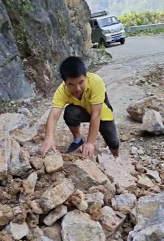 由于前期暴雨天氣,焦厚松車才開到半路,就看到前方的路有了滑坡,緊靠著崖壁的道路已經(jīng)垮了一半?!暗纛^還是前行?”焦厚松最終戰(zhàn)勝了猶豫,“答應(yīng)了用戶今天送到,不能就這樣放棄,先看看情況。”他開始下車觀察路況,發(fā)現(xiàn)主要是碎石堵住了前方七八米的路程?!叭绻謇硪恍囕v就能開過去?!闭f干就干,焦師傅隨后就開始徒手清理路上的石塊。