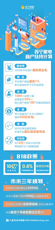 蘇寧宣布,2020年蘇寧將免收平臺(tái)商戶服務(wù)費(fèi);平臺(tái)上的商品供應(yīng)鏈會(huì)向蘇寧生態(tài)中10萬+實(shí)體小店開放,幫助商戶擴(kuò)大銷售通路。同時(shí),大家電行業(yè)線將持續(xù)給平臺(tái)商戶匹配站內(nèi)外的億級(jí)流量,并通過星河生態(tài)賦能平臺(tái)開放1000+運(yùn)營工具,針對(duì)核心商戶提供1對(duì)1專屬運(yùn)營指導(dǎo),借此幫助商戶有效提升經(jīng)營效率,降低運(yùn)營成本。818期間,平臺(tái)訂單傭金從最低1%降至0.8%,針對(duì)核心單品提供雙百億補(bǔ)貼,且向平臺(tái)商戶給予10億+的流量導(dǎo)流扶持,幫助商戶全面應(yīng)戰(zhàn)818。