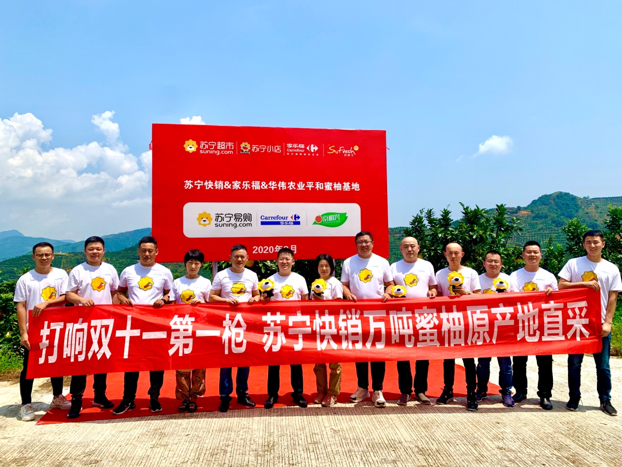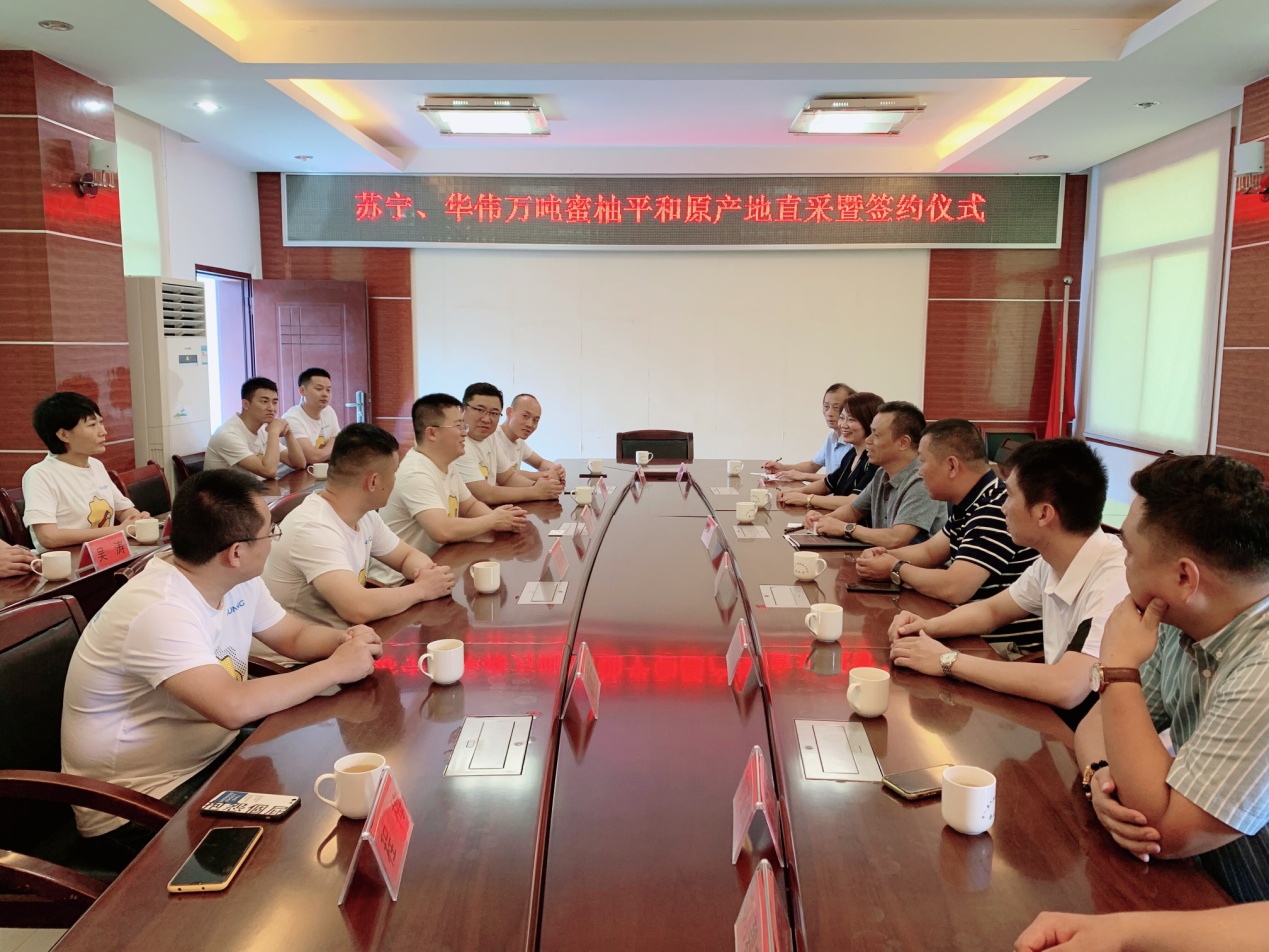 8月26日,蘇寧家樂(lè)福中國(guó)區(qū)生鮮采購(gòu)總監(jiān)孫樂(lè)超、水果組總監(jiān)孟碩、華南區(qū)采購(gòu)總監(jiān)周益明,以及蘇寧易購(gòu)水果組采銷總監(jiān)戴躍等一行來(lái)到位于福建省平和縣的華偉農(nóng)業(yè)蜜柚基地,與平和縣委書(shū)記郭德志等地方領(lǐng)導(dǎo)共同宣布蘇寧家樂(lè)福&華偉農(nóng)業(yè)蜜柚直采基地的正式啟動(dòng)。