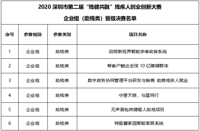 2020深圳市第二屆“殘健共融”殘疾人創(chuàng)業(yè)創(chuàng)新大賽團(tuán)隊組(助殘類)晉級決賽名單